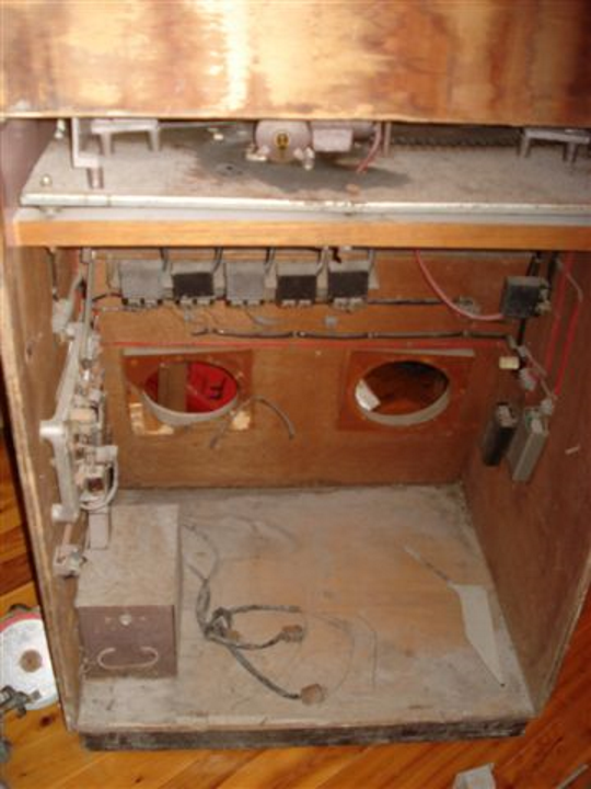 The new stereophonic sound was produced by two 8" Rola speakers located in the front of the cabinet covered by metal grills. The speakers were slightly angled outwards to produce that great new stereophonic sound.