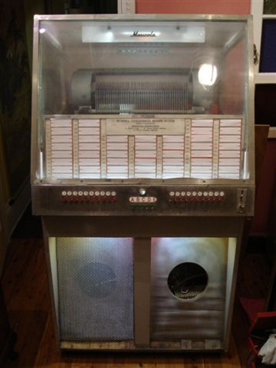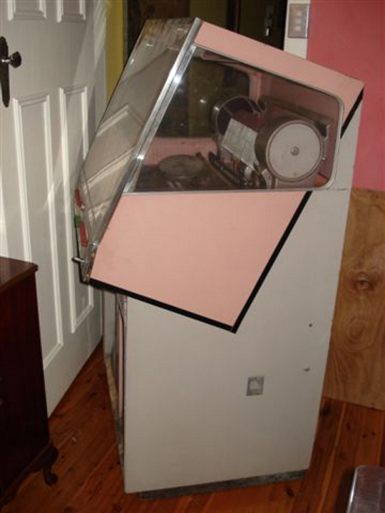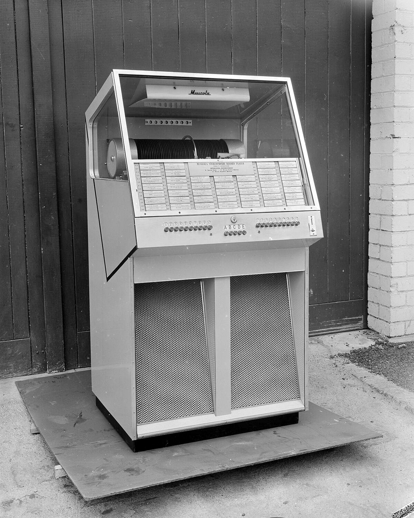 The Musicola Logo in plastic lettering was mounted above the record playing mechanism on backlit white perspex. Instructions on selection and operation were located on a cardboard label displayed within the selection panel titles.
