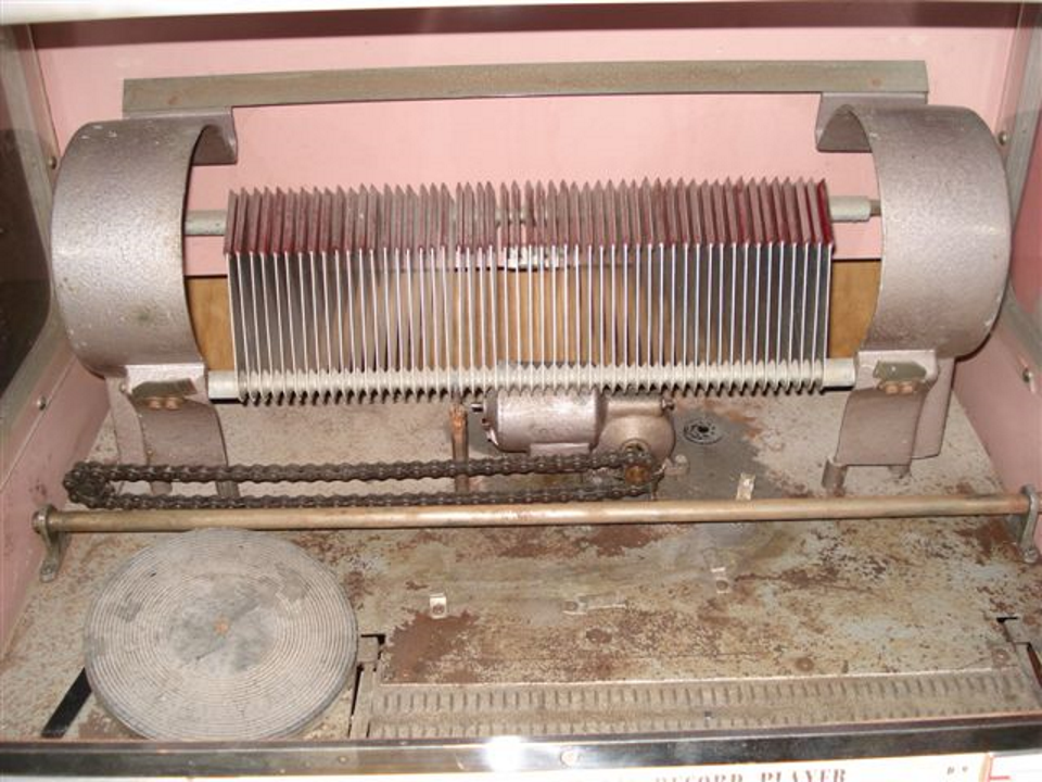 Music selection was made by a push buttons on the faceplate that consisted of two banks of red push buttons numbered 1-20 and a separate green bank in the middle lettered A-E.